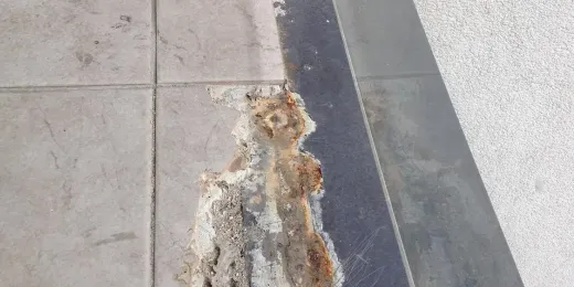 Przyczyna trzecia to korodujące okapniki. Balkonowe obróbki blacharskie mocowane są mechanicznie do podkładu cementowego. W systemach klejonych, w których posadzka ceramiczna układana jest na mineralnej zaprawie klejowej, blachy okapowe zatapiane są w warstwę mineralnej zaprawy uszczelniającej. Ponieważ w strefie okapowej mamy do czynienia z podwyższonym poziomem wilgotności, oddziaływujące na blachę zaprawy wykazują silnie działanie korozyjne. Powłoki lakiernicze powlekanych blach stalowych ulegają bardzo szybko postępującej destrukcji nie tylko w części podposadzkowej, ale również w części zewnętrznej. Pozbawiona powłok ochronnych blacha stalowa zaczyna równie szybko korodować. To dlatego odnotowuje się przypadki perforacji okapników wykonanych ze stalowej blachy powlekanej już po kilku miesiącach od zakończenia prac wykończeniowych. Oddziaływanie korozyjne wilgotnych zapraw cementowych, klejowych i uszczelniających jest tak silne, że obróbki balkonów wykonane z miedzianych czy nierdzewnych blach również korodują. Oczywiście proces korozji w przypadku tych metali trwa dłużej i ma inny przebieg, ale efekt końcowy jest taki sam jak w przypadku okapników z blach stalowych.