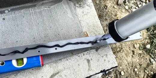 Osadzamy koszulki kołków montażowych. Na odtłuszczoną powierzchnię wspornika na jego tylnej ściance nanosimy uszczelniacz Hertalan KS96 wokół otworów montażowych fot. 37. Następnie wsporniki przykręcamy do stopnicy.