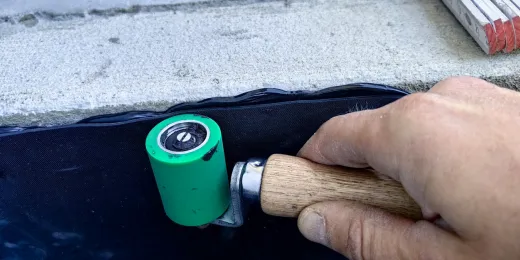 Po odmierzeniu wymiarów pierwszej podstopnicy, docięto pasmo folii EPDM Hertalan EASYCOVER, następnie na podłoże oraz na membranę EPDM naniesiono klej dwustronny Hertalan KS137 i po odczekaniu około 15 minut, membranę przyłożono w docelowym miejscu. Całą powierzchnię dociśnięto rolką silikonową, a krawędzie zamknięto uszczelniaczem Hertalan KS96 fot. 16.