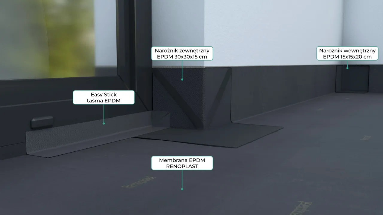 Hydroizolacja EPDM to zestaw materiałów umożliwiających wykonanie warstwy izolacji przeciwwodnej na tarasach i balkonach z posadzką wentylowaną i schodach zewnętrznych z okładziną wentylowaną. Głównym elementem hydroizolacji jest membrana EPDM o grubości 1,1 mm. Pozostałe elementy hydroizolacji na balkon to narożniki wewnętrzne i zewnętrzne EPDM, taśma samoprzylepna EPDM laminowana butylem, kołnierz uszczelniający EPDM, klej i uszczelniacz do membran EPDM. Hydroizolacja EPDM jest jedyną hydroizolacją o pełnej odporności na oddziaływanie agresywnego środowiska chemicznego, jakie może pojawić się na tarasach, balkonach i schodach zewnętrznych, w tym na działanie środków do odmrażania oraz chemii używanej do czyszczenia. Występująca jako uszczelnienie tarasu w technologii klejonej hydroizolacja EPDM jest prosta do wykonania - nie wymaga użycia skomplikowanego i kosztownego sprzętu, jak ma to miejsce przy wykonywaniu łączeń zgrzewanych. Wszystkie profile okapowe Renoplast do posadzek wentylowanych są przygotowane do zastosowania z hydroizolacją EPDM.