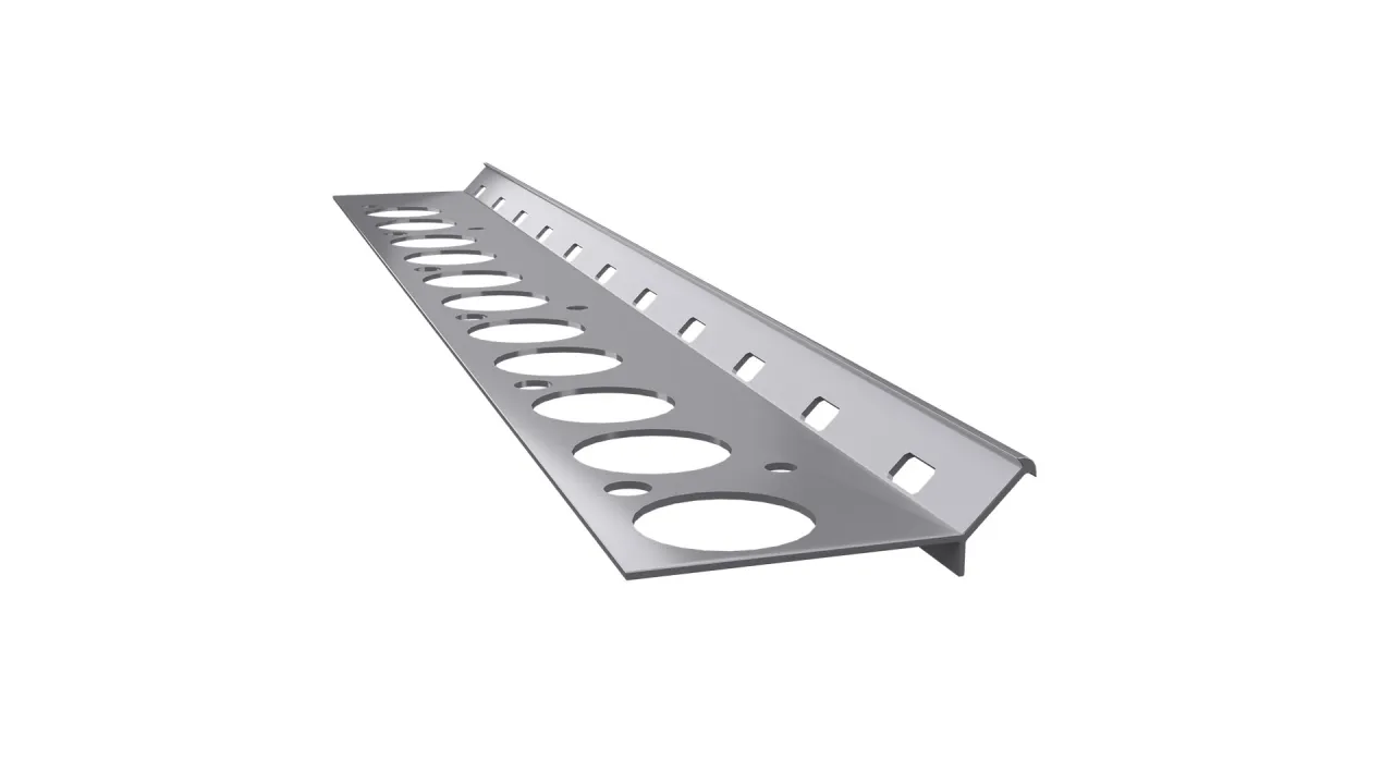 Podstawowy profil schodowy V2 służy do wykończenia i wzmocnienia krawędzi schodów z okładziną wykonaną w technologii kamiennego dywanu na styku stopnicy i podstopnicy.