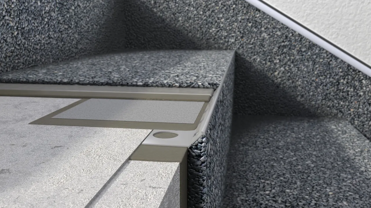 Systemowe wykończenie i wzmocnienie krawędzi schodów z okładziną wykonaną w technologii kamiennego dywanu na krawędzi stopnia schodowego.