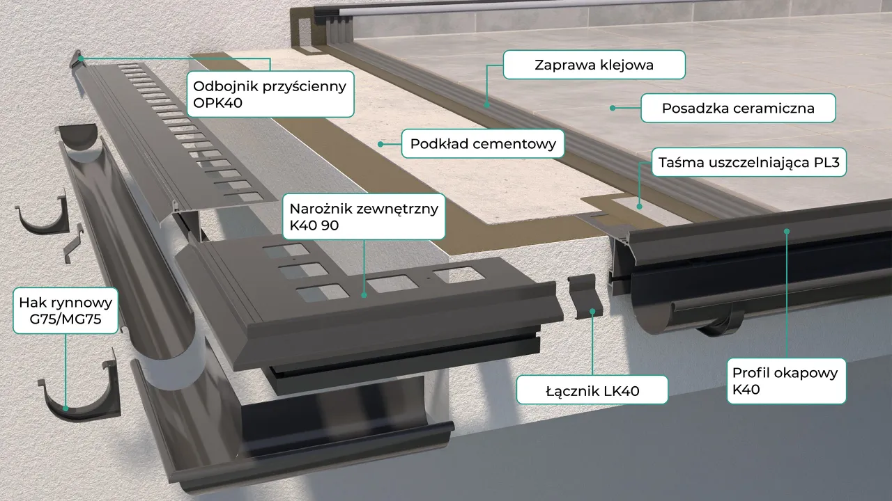 System do wykonania tarasów i balkonów z posadzką z płytek ceramicznych układanych na mineralnej zaprawie klejowej z uszczelnieniem podpłytkowym z zaprawy uszczelniającej, charakteryzujący się zastosowaniem masywnych profili okapowych K40 z szerokim oparciem na podkładzie cementowym. Ich budowa zapewnia pełną szczelność pomiędzy profilem okapowym a posadzką z jednoczesnym odprowadzeniem wilgoci z warstw podposadzkowych. Budowa profilu K40 umożliwia montaż rynien PVC Gamrat, Bryza lub Marley o średnicy 75 mm za pośrednictwem haków rynnowych G75 lub MG75. Ponadto profil K40 posiada wklejony fabrycznie sznur dylatacyjny stanowiący podparcie dla uszczelnienia dylatacji pomiędzy profilem a posadzką oraz ochrony otworów odwadniających przed ich zasłonięciem zaprawą klejową w trakcie wykonywania prac. W skład systemu wchodzą profile okapowe K40 z elementami uzupełniającymi jak narożniki zewnętrzne i wewnętrzne K40 90 i K40 135 o kątach 90 i 135 stopni, łączniki LK40 i odbojniki przyścienne OPK40, taśma uszczelniająca PL3, taśma progowa. Wykonanie tarasu lub balkonu w technologii klejonych płytek ceramicznych z wykończeniem strefy okapowej profilem K40 zapewnia skuteczne odprowadzenie wody opadowej z powierzchni posadzki, pełną szczelność konstrukcji, trwałość i odporność antykorozyjną profili, kompletność systemowego rozwiązania oraz estetyczny wygląd.