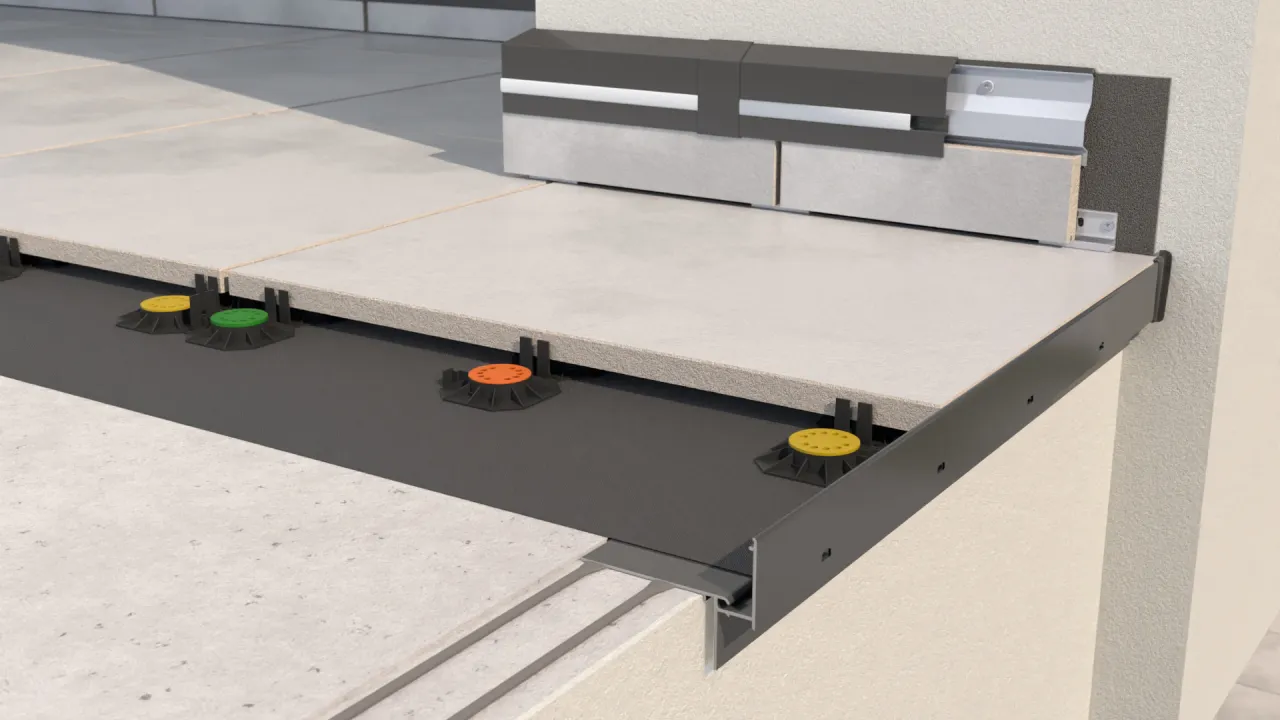 System do wykonania tarasów i balkonów z posadzką wentylowaną z płyt ceramicznych o grubości 2 cm na wspornikach tarasowych nieregulowanych SMART lub opcjonalnie na wspornikach regulowanych RENOPAD PRO 13-18 mm.